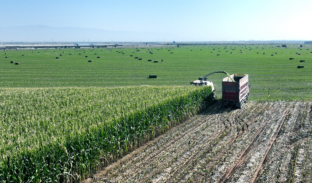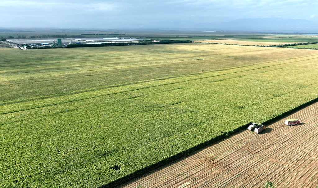 来到石岗墩畜牧园区前进牧业饲草种植基地,大型青贮秸秆收割机和运输车辆正开足马力在田间来回穿梭。伴随着隆隆的机器轰鸣声,一排排两米多高的青贮玉米瞬间被连杆带棒地收割,并粉碎成2.4厘米左右的青贮料,随后被迅速装车运往各牧场。这一高效的机械化收割场景,不仅展现了现代农业的强大力量,也极大地提高了收割效率,减轻了种植户的劳动负担。